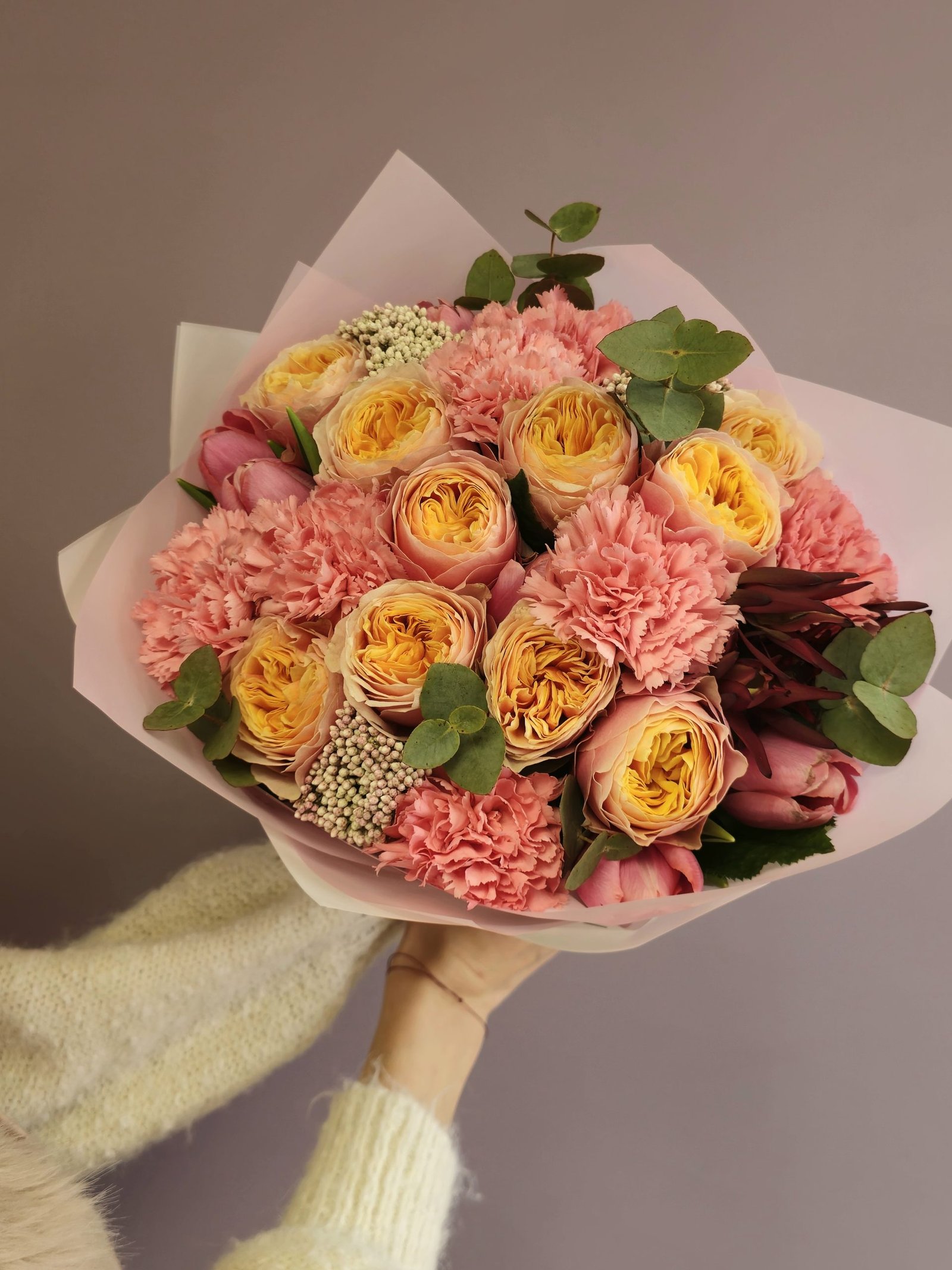 Išskirtinė puokštė ypatingai progai. Puokštės akcentas – rūšinės, itin kruopščiai auginamos, bijūninės rožės. Į puokštę taip pat komponuojami gvazdikai, Ekvadorinė žaluma, eukaliptas, arba kiti, nuo sezono priklausantys, priedai.