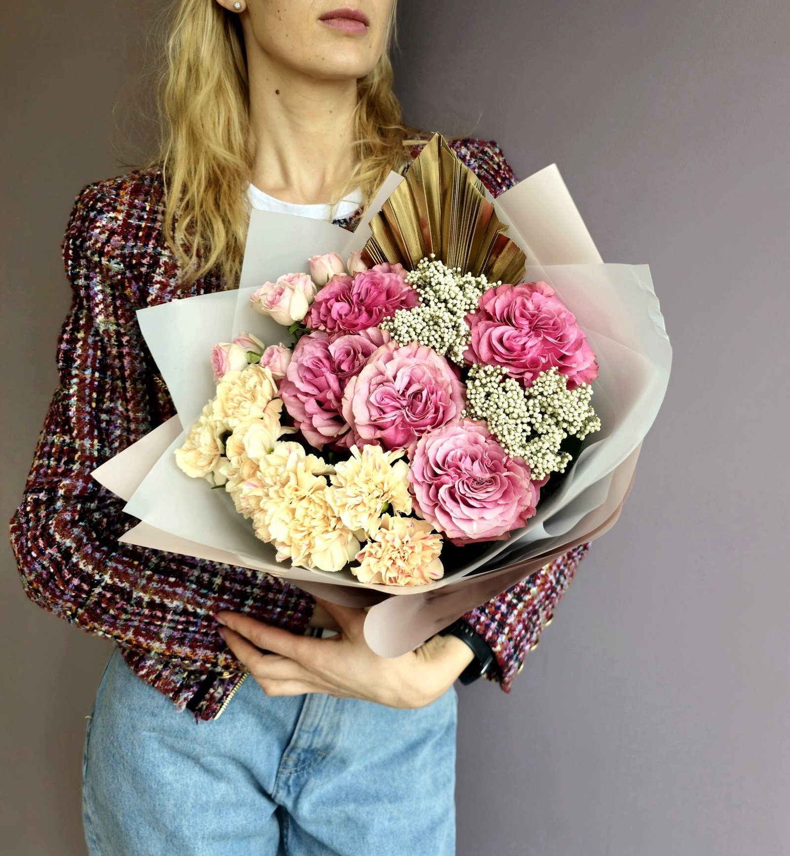 Puokštė sukomponuota iš aukšta kokybe pasižyminčios Ekvadoro produkcijos. Ryškios išskirtinės rožės, sukomponuotos su gvazdikais, daugiažiedėmis rožytėmis ir prabangiąja „Rice Flower“.
